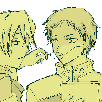 すみません。 日々レイブレのことを考えて仕事を乗り切ってます。 レイブレいいよ、ブレイクさいこー! ↓ここからはいつもの妄想。 『肩を寄せ合い夜明けを待とう』 (依存愛五題 リライト様) 「やー、スミマセン」 そう言って後ろ頭を掻くザークシーズに、やめてくれと叫びたくなった。 今彼が着ているのはパンドラ制服のジャケットだけで、それだけで着るには短いそれは、腕を上げて裾が少し上がるだけでとても際どい。 特に前がカシュクールデザインなものだから、彼の白くしなやかな脚の内腿はほぼ見えていると言ってもいい。 彼にとって一回り大きい私のものでなければ、完全にアウトだ。 やきもきする私とは対照的に、まったく動じていない彼が前かがみに脱いだ衣類を掴み上げた。 ……後ろも相当きわどい。 今までどんなに着難くとも不満に思ったことのない制服が今はとても恨めしい。 なんでジャケットがこんなデザインなのか。 なんでベストとジャケットをわけたのか。 ロングジャケットにしてくれればこんな葛藤はなかったのに。 こんなことなら袖がなくともベストを与えるべきだったかと後悔しても、すでにそれは濡れた奴の身体を拭ったせいで湿っている。 濡れた衣服を絞って干していく後ろ姿に、視線をどこに置いていいやらわからずうろたえる。 動くたびに見え隠れする白の面積に居たたまれなくて、背を向けて座り込んだ。 外は雷雨が収まらず、このままではもう少しここで過ごすことになりそうだ。 「まったく、傘があるのに雨を被る馬鹿がどこに居るか」 その馬鹿がここに居るからこそこんなことになっているのだが、思わず愚痴も漏れる。 「だってあの時は小雨だったじゃないですカ」 なんか雨に当たりたいデス、と一本しかなかった傘を抜け出した途端、ざばりと有り得なく増えた雨脚。 天候に逆らえるはずもないが、大人しく傘に納まっていてくれればよかったのだ。 まったく、いつものことながら、こいつの突飛な行動には振り回されてばかりだ。 「くしゅっ」 小さなくしゃみとともに背中に感じた重みに、思考が遮られる。 布越しにもわかる冷えた背中が寄りかかってきて。 「寒いデス」 告げられた語尾が、僅かに震えていた。 ああ本当に寒いのだろうと思っても、もう与えられるものもなく、迷った末にスカーフを取って渡す。 「…素肌にスカーフとジャケットって、なんか変態みたいじゃないですカ?」 「変態が何を言う」 無いよりマシだろうと、有無を言わせず首に巻きつけてしまう。 「私の服、まだ乾きませんかねェ」 見つめる先には、雫の滴るほどに濡れた服。 雨は止みそうもない。 せめてもと、床にあった手を握って温もりを分けた。 自分で書いといてなんだけど、どんなシチュだこれw |